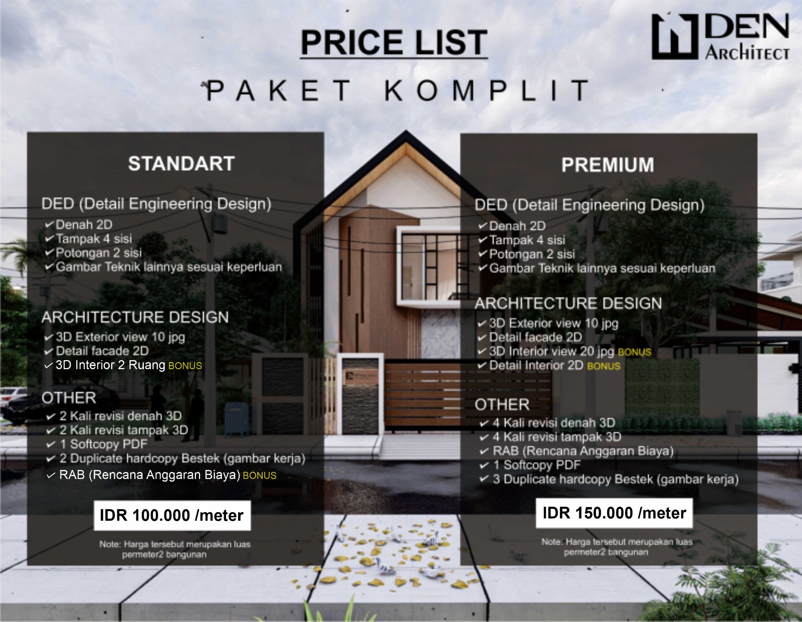 DEN Architect melayani dan mendesain bangunan anda dengan harga yang terjangkau karena mengacu pada luas bangunan anda.